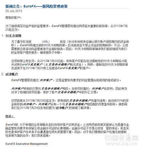 中國(guó)經(jīng)濟(jì)網(wǎng)北京11月7日訊(“民生說(shuō)道”記者 臧允浩)近日,一家名為EuroFX的公司在中國(guó)境內(nèi)多省市以投資外匯名義開(kāi)展理財(cái)業(yè)務(wù)。有多名投資者向中國(guó)經(jīng)濟(jì)網(wǎng)投訴稱(chēng),其用于交易的賬戶(hù)自七月份至今,已無(wú)法提現(xiàn)。EuroFX公司方面也難以聯(lián)絡(luò)到,有投資者懷疑該公司實(shí)際是以炒外匯之名,行欺騙之實(shí)。 據(jù)悉,EuroFX自稱(chēng)是一家權(quán)威的投資理財(cái)管理公司,行政辦事處設(shè)在倫敦的梅費(fèi)爾,客戶(hù)中心位于倫敦蒼鷺大廈,是新西蘭金融監(jiān)管機(jī)構(gòu)服務(wù)協(xié)會(huì)(FSP)的合法注冊(cè)企業(yè),為黃金、白銀、卓越三類(lèi)客戶(hù)提供外匯交易,客戶(hù)投資后擁有活期賬戶(hù)與交易賬戶(hù),并將資金從活期賬戶(hù)轉(zhuǎn)至EuroFX交易賬戶(hù)在該公司自行研發(fā)的自動(dòng)化交易系統(tǒng)內(nèi)進(jìn)行交易,白銀客戶(hù)每月保守交易盈利9%,黃金客戶(hù)每月保守交易盈利12%,而卓越賬戶(hù)每月保守交易盈利則高達(dá)16%。 中國(guó)經(jīng)濟(jì)網(wǎng)記者登錄EuroFX官網(wǎng),發(fā)現(xiàn)該公司并沒(méi)有在中國(guó)設(shè)立辦事處,留下的聯(lián)系方式也是英國(guó)倫敦的。記者通過(guò)投資者提供的EuroFX公司郵箱向其發(fā)送郵件問(wèn)詢(xún),但截至發(fā)稿前,仍未收到回復(fù)。 動(dòng)輒百萬(wàn)投資 竟無(wú)半紙合同 EuroFX公司的收款賬戶(hù) 2012年10月,經(jīng)朋友介紹,大連的楊女士了解到一家名為EuroFX的公司正在面向中國(guó)人募集資金,這些資金將被用來(lái)炒外匯,月收益率高達(dá)16%?!芭笥迅嬖V我,之前這項(xiàng)業(yè)務(wù)不向亞洲開(kāi)放,直到金融危機(jī)后,才逐步放開(kāi)”,楊女士告訴記者,“如此之高的收益率,再看到朋友現(xiàn)身說(shuō)法,的確大為心動(dòng)”。 于是,楊女士便一下投入了60余萬(wàn)人民幣。中國(guó)經(jīng)濟(jì)網(wǎng)記者了解到,EuroFX賬戶(hù)的投資額度分三個(gè)等級(jí),最低5萬(wàn)美金是白銀賬戶(hù),月收益率9%,還有最低投入10萬(wàn)美元的黃金賬戶(hù),月收益率12%,以及最低投入15萬(wàn)美元的卓越賬戶(hù),月收益率高達(dá)16%。楊女士的賬戶(hù)就屬于黃金賬戶(hù)。 楊女士告訴記者,投入資金后,EuroFX公司會(huì)為投資者建立一個(gè)賬戶(hù),登錄其官方網(wǎng)站的個(gè)人賬戶(hù)后,能看到自己賬戶(hù)每日的資金狀況?!扒皫讉€(gè)月,的確有其承諾的收益,而且每個(gè)周日都可以申請(qǐng)取現(xiàn),公司會(huì)在三日內(nèi)為你打款”,楊女士稱(chēng),因?yàn)榭吹绞找嫒绱丝捎^,且能及時(shí)兌現(xiàn),她把最早的收益也相繼投入到自己的賬戶(hù)里。 2013年4月,湖南長(zhǎng)沙的張先生也在朋友的勸說(shuō)下,投入65萬(wàn)元人民幣,此后又追加到260余萬(wàn)人民幣。 同樣是今年4月,遼寧鞍山的任先生,也從朋友處聽(tīng)到這一“好消息”,沒(méi)有太多遲疑,他也投入了60余萬(wàn)元開(kāi)立了黃金賬戶(hù)。 與以上幾地的投資者相比,廣東深圳的王女士算是投資額度較小的了。王女士告訴記者,自己向來(lái)謹(jǐn)小慎微,但在朋友反復(fù)勸說(shuō)下,她還是為自己開(kāi)立一白銀賬戶(hù),投資額達(dá)30余萬(wàn)人民幣, 中國(guó)經(jīng)濟(jì)網(wǎng)記者調(diào)查發(fā)現(xiàn),雖然上述投資者投資額度由數(shù)十萬(wàn)到數(shù)百萬(wàn)元人民幣不等,但他們無(wú)一人與EuroFX公司簽署過(guò)任何書(shū)面文件,而這種投資關(guān)系的建立,完全憑借親朋好友的介紹。上述楊女士像記者透露,朋友與自己實(shí)際是“上下線”關(guān)系,介紹一位投資者加入會(huì)有相應(yīng)的提成。 中國(guó)經(jīng)濟(jì)網(wǎng)記者登錄EuroFX網(wǎng)站,在其“常見(jiàn)問(wèn)題解答”一欄中有信息顯示:“Euro Forex的每位客戶(hù)都需要獲得另一位活躍客戶(hù)的推薦。新客戶(hù)需要獲得老客戶(hù)的推薦,以保證我們業(yè)務(wù)的誠(chéng)實(shí)性。如果沒(méi)有合適的推薦人,用戶(hù)無(wú)法自己注冊(cè)為客戶(hù)”。 有投資者懷疑,這其實(shí)是借鑒了傳銷(xiāo)發(fā)展會(huì)員的手法,只不過(guò)是借理財(cái)?shù)拿x,在網(wǎng)絡(luò)中大行其道而已。 賬戶(hù)突然凍結(jié) 至今無(wú)法提現(xiàn) EuroFX公司發(fā)布的公告 2013年7月20日,對(duì)于這些習(xí)慣了每日登陸EuroFX賬戶(hù),查看收益情況的投資者們而言,的確不是一個(gè)好日子。 長(zhǎng)沙的張先生仍然記得,就是在這一天,他登入自己的賬戶(hù)后發(fā)現(xiàn),賬戶(hù)當(dāng)天并沒(méi)有交易記錄,也沒(méi)有產(chǎn)生應(yīng)有的利潤(rùn)。 類(lèi)似的情況,同樣發(fā)生在其他EuroFX投資者身上,不久他們就看到公司的公告。公告顯示,為了遵守反洗錢(qián) (AML) 規(guī)定(針對(duì)未知或未經(jīng)確認(rèn)銀行帳戶(hù)間短期內(nèi)的資金轉(zhuǎn)移),EuroFX將推出新的90天冷卻期政策。反洗錢(qián)規(guī)定不禁止資金的短期轉(zhuǎn)移;不過(guò),公司需要就這類(lèi)活動(dòng)向監(jiān)管者進(jìn)行全面的報(bào)告。因此,90天冷卻期政策確保我們能夠繼續(xù)為我們的全球客戶(hù)提供服務(wù),確保服務(wù)不中斷。 這則公告還宣布,EuroFX管理層將推出