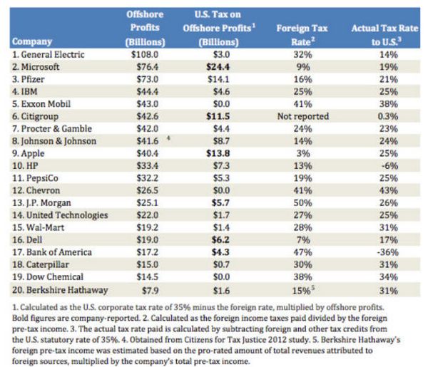 大多數(shù)的公司都并沒有提供如果它們將利潤遣返回國將會要負(fù)責(zé)承擔(dān)多少稅款估算。據(jù)該網(wǎng)站指出,前十家公司占有著68%的離岸利潤。一些高科技公司–微軟公司(Microsoft)、蘋果公司(Apple)和戴爾公司(Dell)–將其實際的外國稅率保持在低于10%的水平。