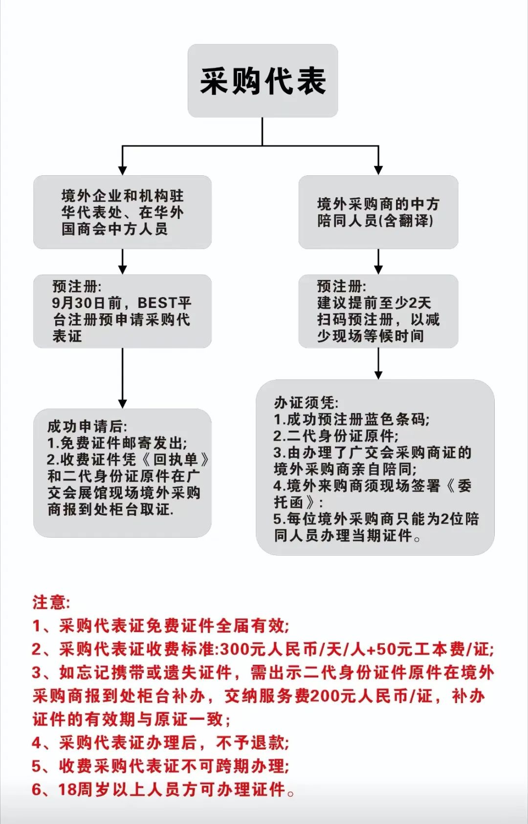 第134屆廣交會恢復設立采購代表證,將實行“預注冊、預審核、郵寄辦證(定向邀請)、現(xiàn)場取證”的辦證模式。向以下兩類人員開放申請辦理: