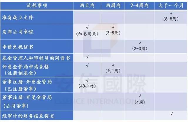 在開(kāi)曼群島設(shè)立對(duì)沖基金,主要流程事項(xiàng)所需時(shí)間如下所示: