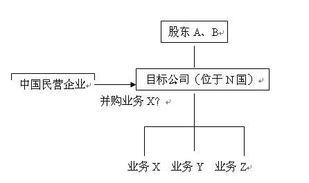 在此結(jié)構(gòu)中,中國民營企業(yè)當然可以以企業(yè)為股東在 N 國當?shù)卦O(shè)立公司,來并購業(yè)務(wù) X 。但在將來,如果要對該當?shù)毓具M行任何運作,均會涉及到中國及 N 國法律限制問題。同時,目標公司的兩個股東 A 鐘情于業(yè)務(wù) X ,仍希望進行發(fā)展,而股東 B 則希望通過轉(zhuǎn)讓收取收益。如何實現(xiàn)呢?