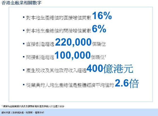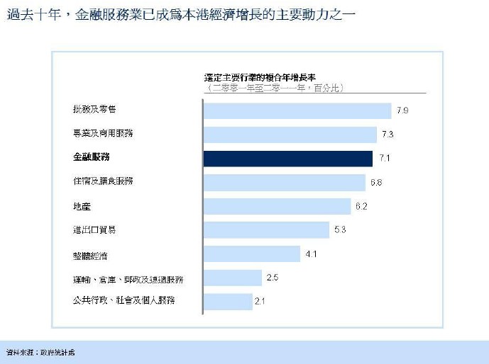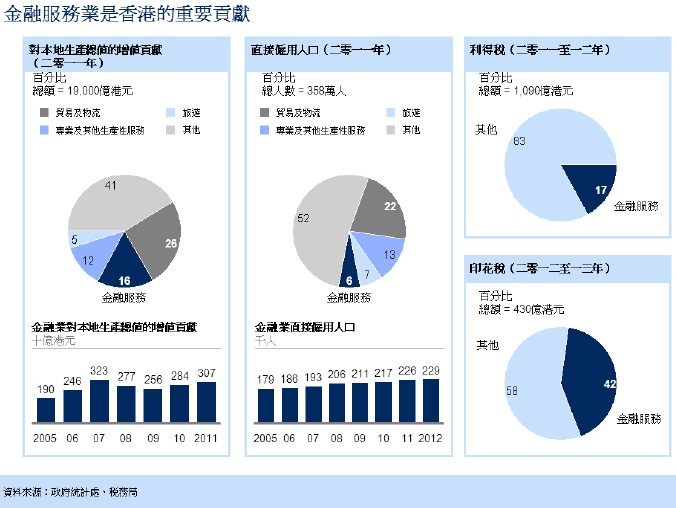 5. 金融服務(wù)業(yè)對(duì)香港本地生產(chǎn)總值的直接貢獻(xiàn)在二零一一年高達(dá)3,000億港元,占本地生產(chǎn)總值的16%,是香港經(jīng)濟(jì)第二大支柱行業(yè)。過去十年,金融服務(wù)業(yè)的復(fù)合年增長(zhǎng)率達(dá)7%,較整體經(jīng)濟(jì)增長(zhǎng)率高出近一倍,是推動(dòng)香港經(jīng)濟(jì)增長(zhǎng)的主要?jiǎng)恿?。金融服?wù)業(yè)也是政府稅收的主要來源,于二零一一至一二年的利得稅及印花稅貢獻(xiàn)超過400 億港元,同時(shí)亦為香港創(chuàng)造不少優(yōu)質(zhì)職位,除直接雇用超過22.8 萬(wàn)人之余,更間接為如法律、會(huì)計(jì)、運(yùn)輸和地產(chǎn)等相關(guān)行業(yè)創(chuàng)造大量就業(yè)機(jī)會(huì)。金融服務(wù)業(yè)對(duì)其他行業(yè)的帶動(dòng)效應(yīng),例如物業(yè)及專業(yè)服務(wù),以及運(yùn)輸、旅游及通訊等行業(yè)的需求,于二零一一年估計(jì)約達(dá)1,100 億港元。