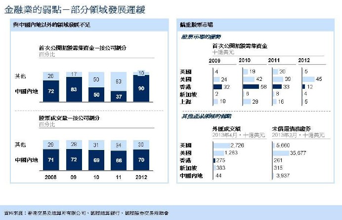 (e) 金融服務(wù)業(yè)需要更多元化 - 香港股票市場(chǎng)的競(jìng)爭(zhēng)力有目共睹,二零零九年至二零一一年間,香港交易所的首次公開招股集資額連續(xù)三年居全球榜首,且過去十年每年都位列前五名。然而,香港偏重股票市場(chǎng),導(dǎo)致債券、外匯及商品業(yè)務(wù)發(fā)展相對(duì)遲緩。香港偏重單一市場(chǎng),意味著金融業(yè)的整體抗逆能力較弱,在股票市場(chǎng)不振之時(shí)尤為明顯。過去十年間,內(nèi)地是香港金融服務(wù)業(yè)增長(zhǎng)的主要?jiǎng)恿?,特別是在股票市場(chǎng)方面,過去五年間,內(nèi)地公司占首次公開招股集資額的59%,每日股票成交量更達(dá)七成。內(nèi)地市場(chǎng)的主導(dǎo)地位,令香港較忽略投入資源發(fā)展亞洲其他高潛力市場(chǎng),亦未有如競(jìng)爭(zhēng)對(duì)手般把握市場(chǎng)份額。在贊揚(yáng)股票市場(chǎng)及協(xié)助中國(guó)企業(yè)集資方面取得成就的同時(shí),香港需要營(yíng)造更多元化及更具韌力的金融服務(wù)業(yè),以鞏固作為真正多元化國(guó)際金融重鎮(zhèn)的地位。