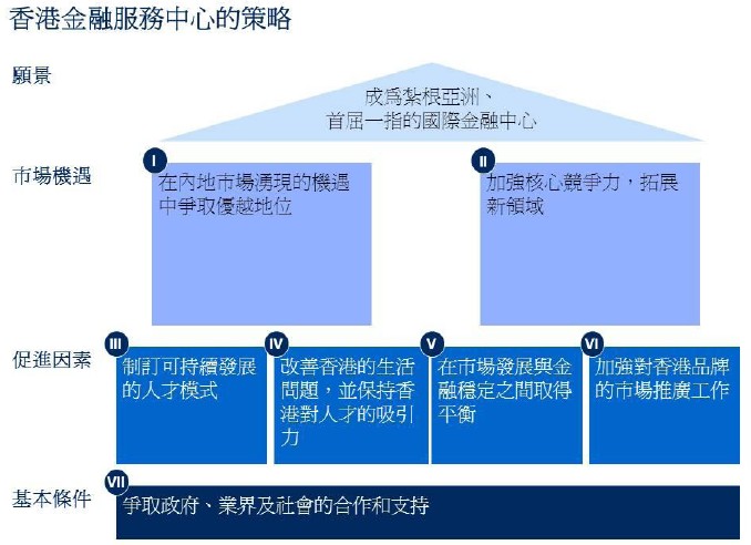 9. 我們認(rèn)為,香港金融服務(wù)業(yè)的整體策略應(yīng)包括四項(xiàng)元素:愿景、市場(chǎng)機(jī)遇、促進(jìn)因素及基本條件。以上組成部分是我們進(jìn)一步發(fā)展的基石。
