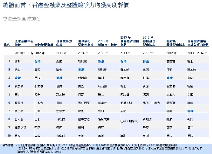 14. 香港是國(guó)際知名的主要金融中心,經(jīng)濟(jì)及營(yíng)商環(huán)境均具備優(yōu)厚的競(jìng)爭(zhēng)力。環(huán)顧多份國(guó)際研究報(bào)告,香港在至少四份報(bào)告中排名榜首,其中在世界經(jīng)濟(jì)論壇公布的二零一二年金融發(fā)展指數(shù),香港更連續(xù)第二年蟬聯(lián)首位,亦是首個(gè)位居榜首的亞洲金融中心。