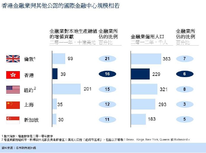 13. 對(duì)世界其他頂尖金融中心(包括香港在內(nèi))的檢討顯示,金融服務(wù)業(yè)在倫敦、紐約、新加坡及上海均擔(dān)當(dāng)舉足輕重的角色。在上述城市當(dāng)中,按對(duì)國(guó)內(nèi)生產(chǎn)總值增值貢獻(xiàn)百分比計(jì)算,倫敦的金融服務(wù)業(yè)占當(dāng)?shù)亟?jīng)濟(jì)的比例最高,達(dá)20.8%,其次是香港(16.1%)、紐約(15.2%)、上海(11.9%)及新加坡(11.1%)。按就業(yè)人口計(jì)算,紐約的金融服務(wù)業(yè)占全市就業(yè)人口的百分比最高,達(dá)8.3%,其次是倫敦(7.2%)、香港(6.3%)、新加坡(5.5%)及上海(3.1%)。