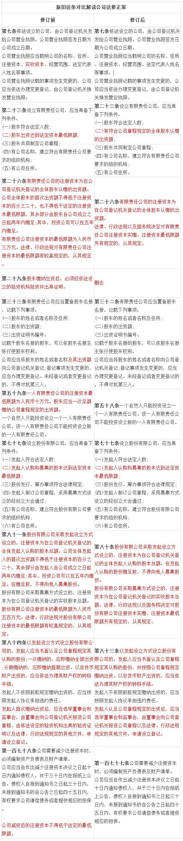 除對(duì)公司注冊(cè)資本最低限額有另行規(guī)定的以外,取消了有限責(zé)任公司、一人有限責(zé)任公司、股份有限公司最低注冊(cè)資本分別應(yīng)達(dá)3萬(wàn)元、10萬(wàn)元、500萬(wàn)元的限制;不再限制公司設(shè)立時(shí)股東(發(fā)起人)的首次出資比例以及貨幣出資比例。