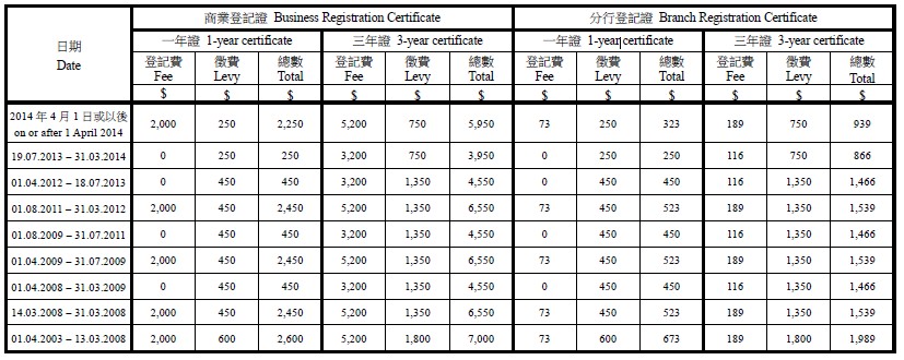 《2013 年收入(減少商業(yè)登記費(fèi))令》將于 2014年 4 月 1 日屆滿。業(yè)務(wù)經(jīng)營(yíng)者須就于該日或之后1生效的商業(yè)或分行登記證繳付訂明的商業(yè)登記費(fèi)或訂明的分行登記費(fèi)(視屬何情況而定)和征費(fèi)。就每張登記證須繳付的金額,請(qǐng)參閱商業(yè)登記費(fèi)及征費(fèi)收費(fèi)表。