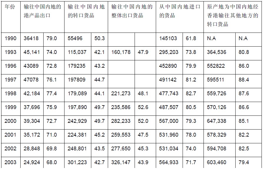 香港外發(fā)加工1貿(mào)易的比率表明,輸往中國內地的轉口貨品中涉及外發(fā)加工的比重從1990年開始總體下降趨勢,除1999和2000年有一個小高峰(但仍低于1990年水平);從中國內地進口的貨品中涉及外發(fā)加工的比重從1999年開始持續(xù)下降,占來源地比例的下降說明外發(fā)內地加工產(chǎn)品直接付運的增加。這可從《香港貿(mào)易及貿(mào)易支援服務》的研究報告獲證,該報告表明:在受訪公司所銷售的中國產(chǎn)品中,絕大部分經(jīng)香港轉口往海外市場,但轉口所占比例由1991年的81%下降至75%。同時,轉運和直接付運的比重則分別由11%和8%上升至13%和12%。各地經(jīng)香港對內地轉口的年均增長率由八十年代的54.7%降至九十年代的25.5%,內地經(jīng)港轉口年均增長率由八十年代41.9%降至23.7%(閻波,1995)。
