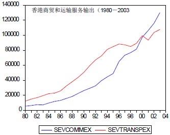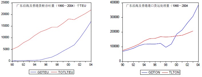 從下圖a可以發(fā)現(xiàn),自2001年開始,以廣州港和深圳港為主體的廣東沿海港口所處理的貨柜吞吐量(GDTEU)呈直線上升趨勢,增長速度快于香港港口的貨柜吞吐量(TOTLTEU)。對于港口貨運處理量(圖b),1998年始,以廣州港和深圳港為主體的廣東沿海港口處理的貨運量(GDTON)的增長速度就快于香港港口,到2000年已超過香港港口貨運處理量(TLTON)。因此,可以得出結論,自2001年始,經(jīng)香港港口轉運逐漸向內地港口直接付運發(fā)展。