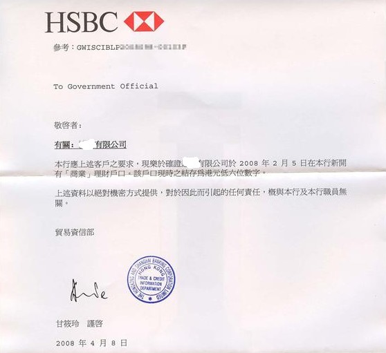 哪位前輩有香港公司匯豐銀行資信證明格式?