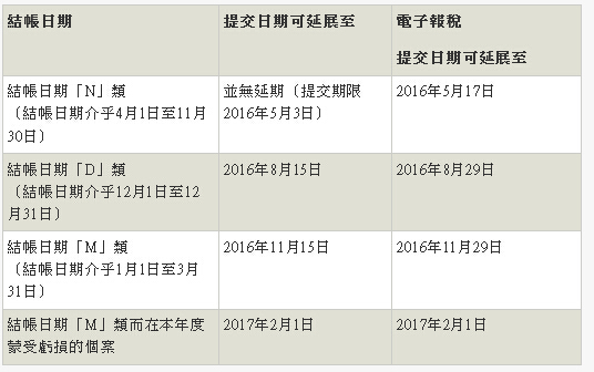 - 如結賬日期為「N」類(結賬日期4月1日至11月30日),那么并無延期(提交期限2023年5月3日) ,如使用電子報稅提交日期可延展至2023年5月17日。