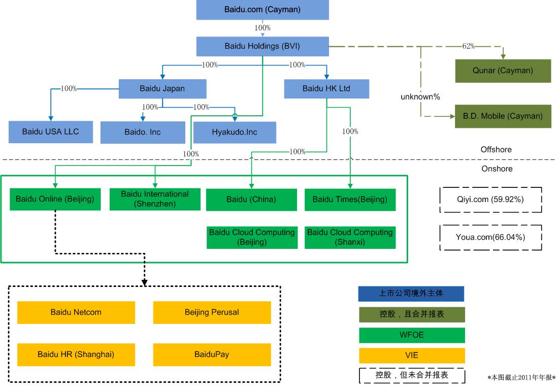 百度公司規(guī)模很大,但是沒(méi)有很復(fù)雜的組織結(jié)構(gòu),一看就懂。黃色的VIE公司只有4家,分別是從事搜索業(yè)務(wù)、人力業(yè)務(wù)和支付。