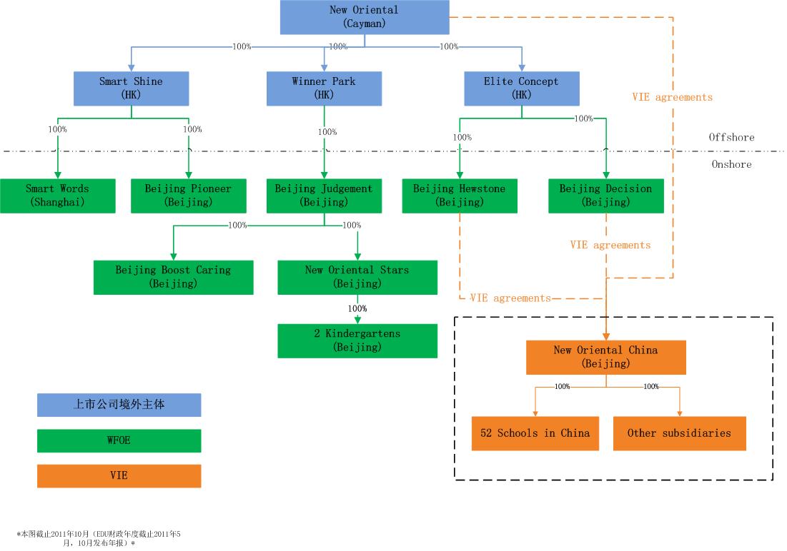 - 關(guān)于新東方的結(jié)構(gòu)圖。本來(lái)20F上就已經(jīng)有新東方的結(jié)構(gòu)圖,但是看到你為了更加表明各個(gè)公司的性質(zhì),增加了一些自己的內(nèi)容。可是在新東方結(jié)構(gòu)圖里面,WFOE并沒(méi)有這么多家。很顯然,三家香港公司直接100%股權(quán)控制的公司是WFOE,但是這些WFOE下的公司卻不為WFOE,而是屬于外商投資境內(nèi)再投資公司。這些再投資公司一般都不再享受外商投資企業(yè)的待遇,也不會(huì)有外商投資企業(yè)批準(zhǔn)證書(shū)這一身份證明。所以將其歸為WFOE是不正確的。另外,可以看到在右下角橙色的VIE這塊,可能是由于為了圖示美觀的原因你省略了NEW ORIENTAL CHINA的股東這一塊。一般來(lái)說(shuō),VIE協(xié)議控制里面,VIE的股東是協(xié)議控制中必不可少的一部分,因此省略了原來(lái)20F里面的股東這塊,會(huì)讓圖示看起來(lái)有點(diǎn)怪。