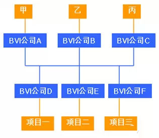 甲、乙、丙三人的海外投資結(jié)構(gòu)需要合理優(yōu)化,借助離岸平臺的優(yōu)化結(jié)果見下圖。首先,由甲、乙、丙三人各自持有一間BVI公司,分別為A、B、C,從而確保投資者信息的不透明性,三人的信息將完全被保密,保證原始投資信息的安全,并且將原本屬于甲、乙、丙三人的共同投資行為從投資人信息上進(jìn)行分離和隱藏,獲得投資者非關(guān)聯(lián)化的效果。其次,A、B、C三間BVI公司共同持有一間BVI公司D,D公司投資海外項(xiàng)目一;A、B、C三間BVI公司共同持有一間BVI公司E,E公司投資海外項(xiàng)目二;A、B、C三間BVI公司共同持有一間BVI公司F,F(xiàn)公司投資海外項(xiàng)目三。由于D、E、F都是BVI公司,依然利用其不透明性保證了投資方的信息安全。最后,用D、E、F三間BVI公司分別持有三個海外項(xiàng)目,達(dá)到了風(fēng)險分散的目的。