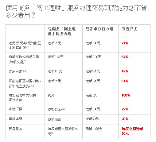 - 經(jīng)商務(wù)「網(wǎng)上理財」服務(wù)辦理貿(mào)易服務(wù) 每項適用交易減收50元,,經(jīng)匯豐分行柜臺辦理,無折扣優(yōu)惠,每項交易手續(xù)費為港幣50元。