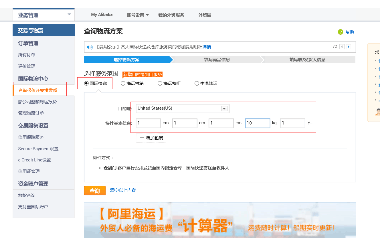 進(jìn)入“查詢報價并安排發(fā)貨”,我們這里選擇國際快遞,以美國為例,選擇一個10kg的包裹