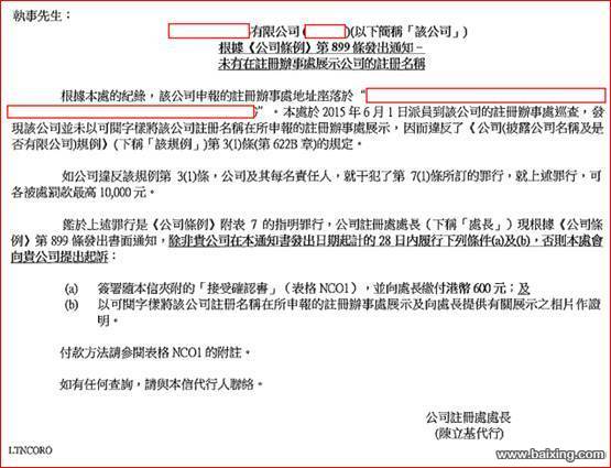 根據(jù)罰款通知書,如公司違反該條例第3(1)條,公司及其每名負(fù)責(zé)人,就犯了第7(1)條所訂的罪行,該罪行可被處罰款最高HKD 10,000元。根據(jù)香港新《公司條例》“主要修改簡(jiǎn)介中的披露公司名稱及是否有限公司”引言中的規(guī)定:為方便用作多間公司的注冊(cè)辦事處或業(yè)務(wù)場(chǎng)所的地點(diǎn)以電子方式展示公司名稱,該規(guī)例載有新條文,訂明凡任何地方是多于6間公司的注冊(cè)辦事處或業(yè)務(wù)場(chǎng)所,只要在每段4分鐘時(shí)段內(nèi),透過(guò)電子器材將注冊(cè)名稱展示最少一次,每次持續(xù)展示最少15秒,或只要在有人透過(guò)電子器材要求展示注冊(cè)名稱后,該名稱能夠于4分鐘內(nèi)展示,則公司已遵從在該地點(diǎn)展示注冊(cè)名稱的有關(guān)規(guī)定(該規(guī)例第3(3)條)。