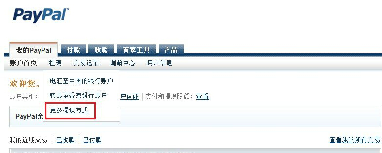 1.登錄您的paypal 賬戶,在提現(xiàn)的選項中選擇“更多提現(xiàn)方式”: