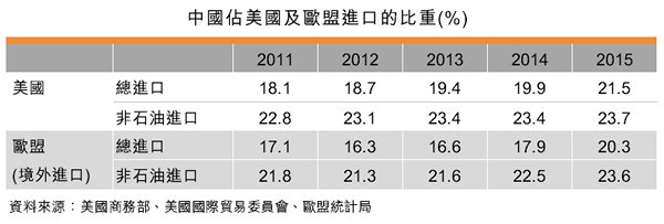 表:中國(guó)占美國(guó)及歐盟進(jìn)口的比重(%)