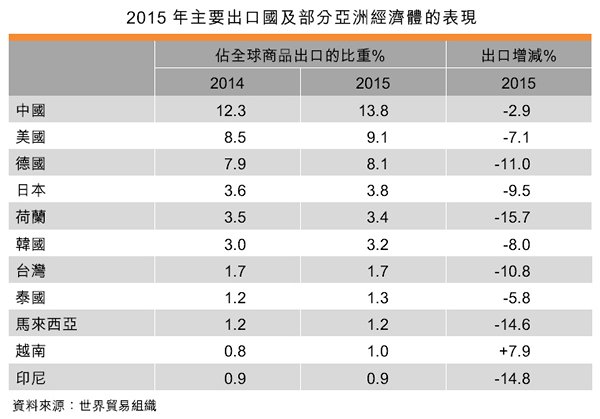 據(jù)世界貿(mào)易組織最近發(fā)表的全球貿(mào)易數(shù)字,2015年全球出口總額為165萬(wàn)億美元,下跌13.2%。2015年中國(guó)出口總額減少2.9%,但在主要出口國(guó)中跌幅卻屬最小。除越南外,中國(guó)出口下跌的速度比亞洲其它生產(chǎn)基地為慢。因此之故,中國(guó)占全球商品出口市場(chǎng)的比重,從2014年的12.3%上升到2015年的13.8%。