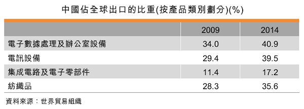中國(guó)的出口正從勞動(dòng)密集型的傳統(tǒng)低檔產(chǎn)品向更先進(jìn)的高科技相關(guān)產(chǎn)品發(fā)展,也從最終消費(fèi)品向上游半制成品發(fā)展。例如,據(jù)世貿(mào)統(tǒng)計(jì),中國(guó)占全球電訊設(shè)備出口的比重,從2009年的29.4%增加到2014年的39.5%,而紡織品所占的比重則從28.3%上升到35.6%。