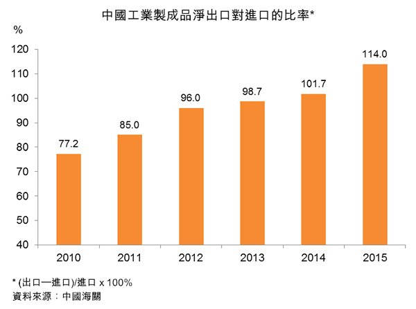 最后裝配工作由中國(guó)轉(zhuǎn)移至亞洲其他低成本產(chǎn)地,有助中國(guó)擴(kuò)大供進(jìn)一步加工用的原材料及半制成品的出口。根據(jù)中國(guó)的統(tǒng)計(jì)數(shù)字,粗略估算,2010至2015年,中國(guó)出口的原材料及半制成品復(fù)合年均增長(zhǎng)9.1%,高于同期整體出口年均增長(zhǎng)7.6%,以及消費(fèi)品年均增長(zhǎng)8.3%的速度。