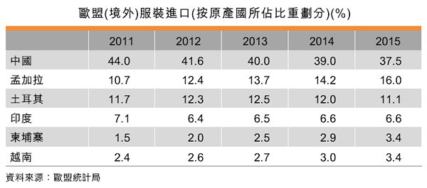 從中國(guó)在全球出口市場(chǎng)所占的比重可見(jiàn)中國(guó)整體出口仍保持競(jìng)爭(zhēng)力。不過(guò),部分生產(chǎn)活動(dòng)從中國(guó)分散至其它生產(chǎn)基地,特別是亞洲其他經(jīng)濟(jì)體,難免影響中國(guó)勞動(dòng)密集型或較低增值產(chǎn)品在海外市場(chǎng)所占的比重。服裝方面,中國(guó)占美國(guó)進(jìn)口的比重由2011年的39.4%降至2015年的37.4%,而越南則是新晉的供應(yīng)國(guó)。歐盟進(jìn)口服裝方面,中國(guó)所占的市場(chǎng)比重也從2011年的44%下降到2015年的37.5%。