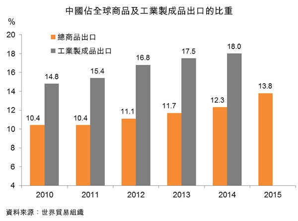 商品出口包括農(nóng)產(chǎn)品、燃料及礦產(chǎn)品。若把出口的范圍收窄到較受生產(chǎn)成本影響的工業(yè)制成品,則世貿(mào)統(tǒng)計(jì)還顯示,近年來(lái),中國(guó)占全球工業(yè)制成品出口的比重一直上升,從2010年的14.8%增至2014年的18% [1]。
