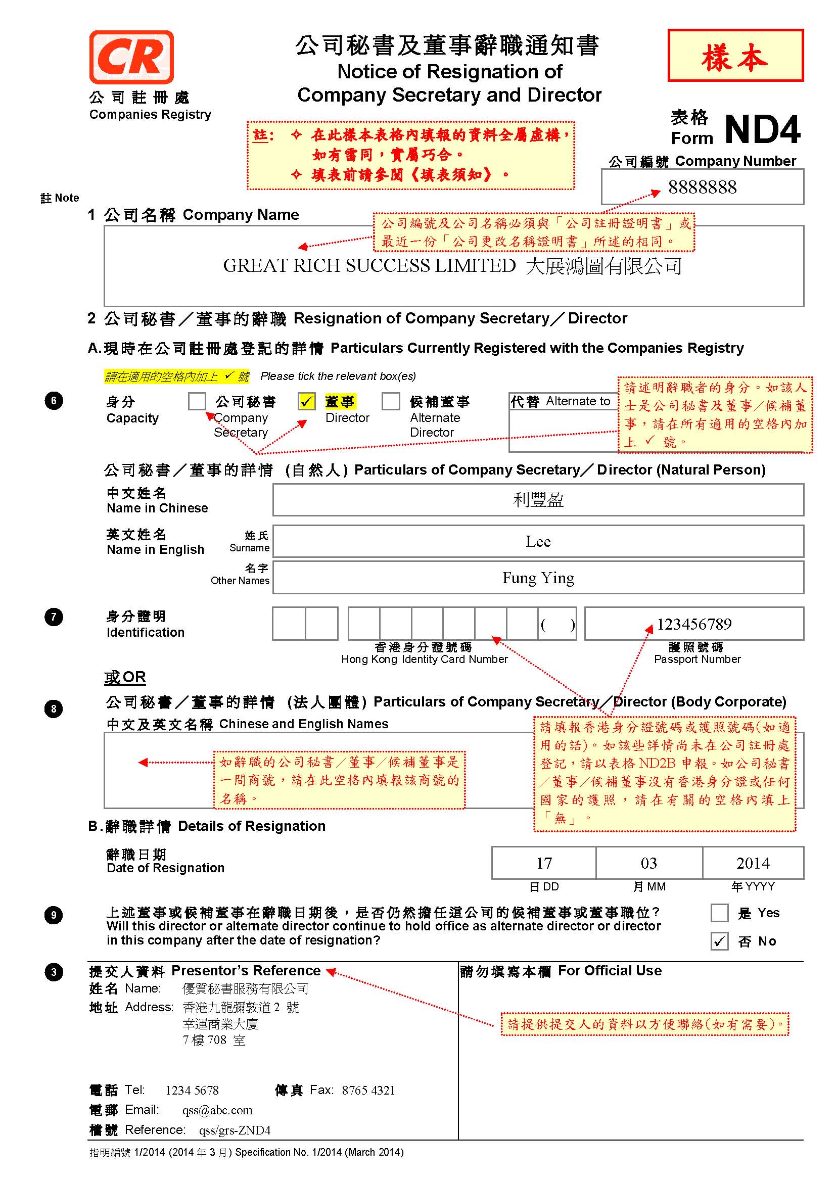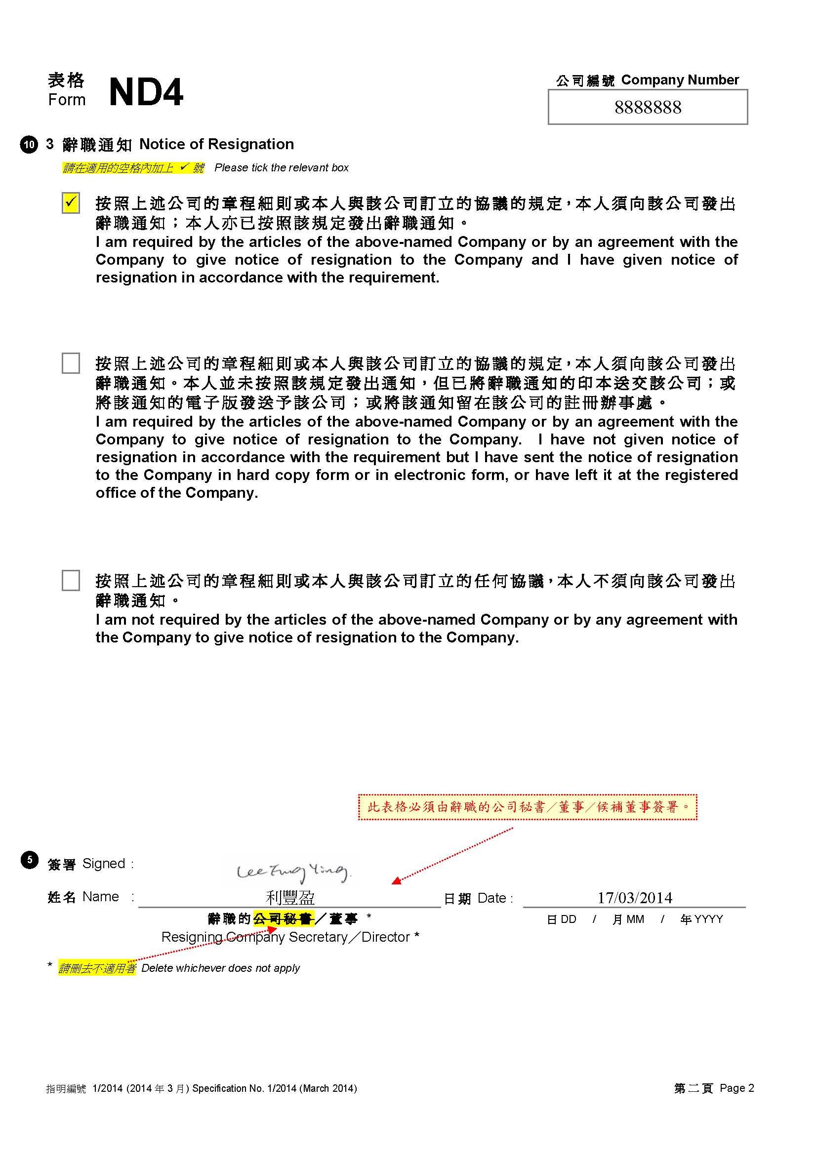 (b)辭職的備用任何董事如有合理理由相信公司將不會(huì)就其辭職一事以表格ND5通知處長(zhǎng),須自行將辭職一事,以表格ND8通知處長(zhǎng).