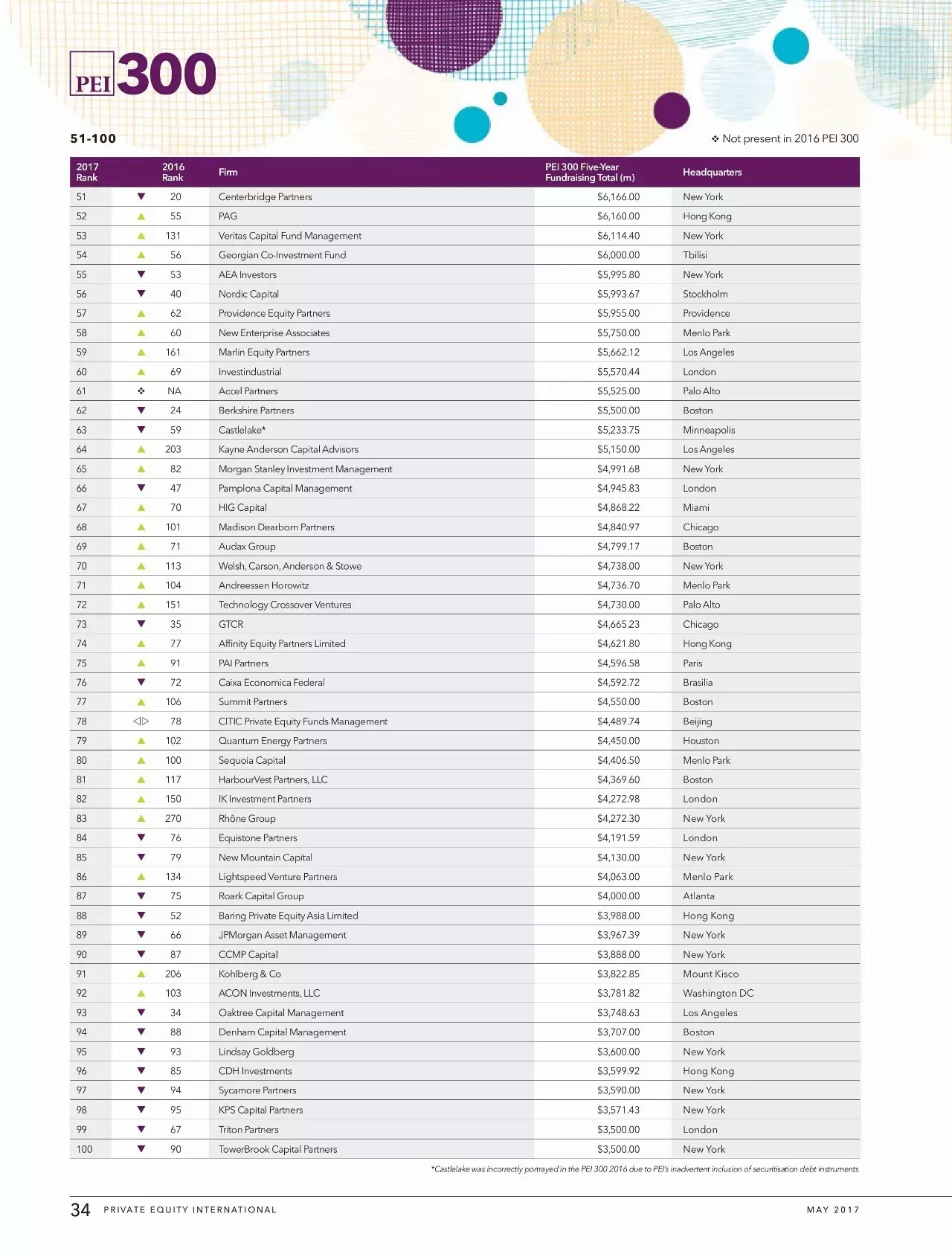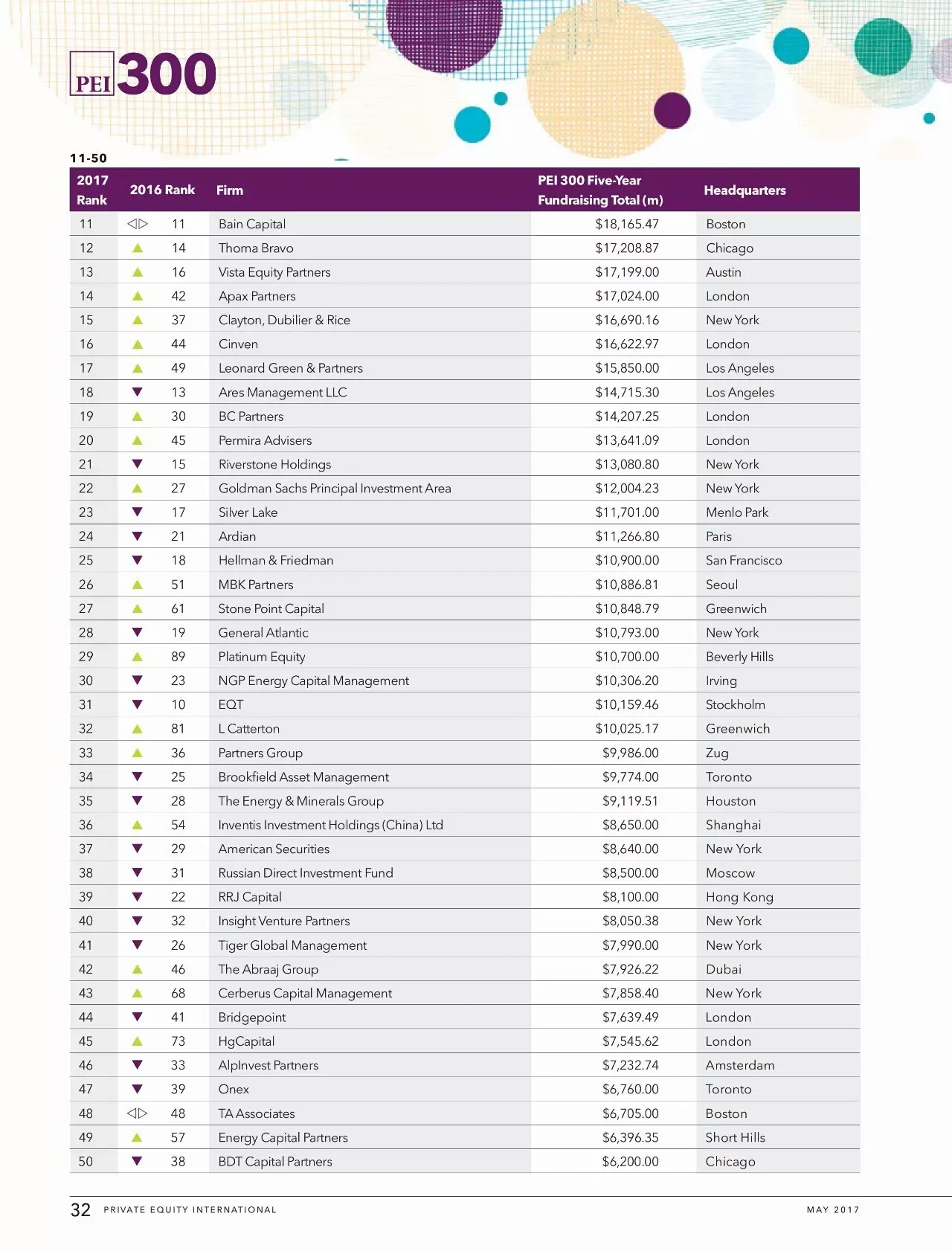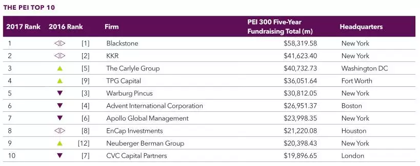 5月7日,倫敦最具權(quán)威的全球另類資產(chǎn)投資(私募股權(quán),債權(quán)投資,房地產(chǎn),etc.) 排名媒體Private Equity International發(fā)布了2016年最新的全球私募股權(quán)機(jī)構(gòu)排名。按照過去五年的融資額進(jìn)行排名,在各個(gè)機(jī)構(gòu)IRR并不透明的今天,融資額作為一個(gè)代表專業(yè)市場認(rèn)可度的指標(biāo),以五年為限,具有相當(dāng)?shù)墓哦取?這里主要提及在中國有業(yè)務(wù)的外資PE以及部分國內(nèi)本土的主流玩家,先看前十七名(將在大陸比較活躍的Silverlake包括進(jìn)來)。