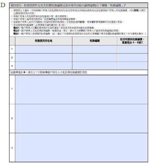 D.第四部份 – 稅務(wù)居民所在地及相關(guān)稅務(wù)編號或具有等同功能的識辨編號(以下簡稱「稅務(wù)編號」)