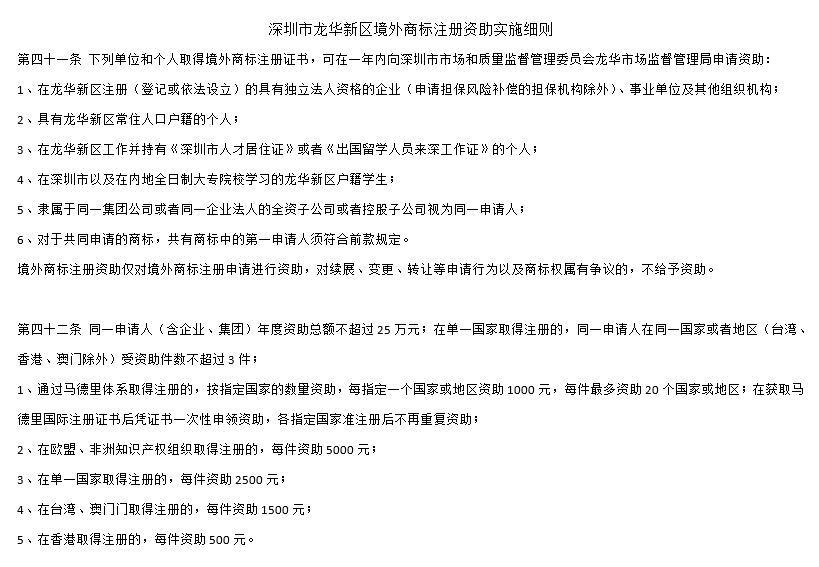 根據(jù)深圳市龍華新區(qū)境外商標注冊資助實施細則第42條
