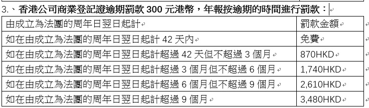 1)香港公司注冊(cè)署——完成周年申報(bào)文件A 時(shí)間:按每一個(gè)周年辦理。B 費(fèi)用:政府收105。C 作用:以做最新的備案,是公司在這一年內(nèi)有沒(méi)有資金、股東、及董事變更、或其他情況等。D 逾期罰款:注冊(cè)處周年申報(bào)逾期費(fèi)用詳細(xì)(按遞交日期不同收取不同費(fèi)用):如在由成立為公司的周年日翌日起計(jì)超過(guò)42天但不超過(guò)3個(gè)月 HKD 870如在由成立為公司的周年日翌日起計(jì)超過(guò)3個(gè)月但不超過(guò)6個(gè)月 HKD 1,740如在由成立為公司的周年日翌日起計(jì)超過(guò)6個(gè)月但不超過(guò)9個(gè)月 HKD 2,610如在由成立為公司的周年日翌日起計(jì)超過(guò)9個(gè)月以上 HKD 3,480最高罰5萬(wàn)及每日罰700 ,所有責(zé)任由董事承擔(dān)。要是您的不打算運(yùn)營(yíng)的話,您最好是選擇停業(yè)或者是注銷公司,否則的話,要是一直公司不做年檢,欠了政府部門(mén)的款項(xiàng),香港的出入境署是有登記的,這樣對(duì)您以后進(jìn)出香港會(huì)有一定的影響。 (2)香港稅務(wù)局——更換商業(yè)登記證A 時(shí)間:證書(shū)上到期的時(shí)間。(可以提前1個(gè)月領(lǐng)?。〣 費(fèi)用:政府收費(fèi)RMB450到2,600之間,此費(fèi)用為政府費(fèi)用,隨政府的調(diào)整而浮動(dòng)。香港政府會(huì)根據(jù)每年的政府財(cái)政運(yùn)營(yíng)支出情況對(duì)香港公司年審的商業(yè)登記證費(fèi)用做一個(gè)調(diào)整,如果政府運(yùn)營(yíng)狀況好的話,那么價(jià)格會(huì)相對(duì)較優(yōu)惠。C 作用:主要是延續(xù)香港公司的合法經(jīng)營(yíng)權(quán)利,同時(shí)銀行也需要這份文件來(lái)證實(shí)公司可以繼續(xù)使用帳戶。D 逾期罰款:商業(yè)登記證失效超過(guò)30天,即會(huì)產(chǎn)生稅務(wù)局登記逾期罰款HKD 300 因上述逾期還可能會(huì)收到法院傳票,被要求上法院應(yīng)訴及支付相應(yīng)的上庭費(fèi)用。 3. 香港稅務(wù)局一般在公司注冊(cè)成立日后18個(gè)月左右發(fā)出第一份報(bào)稅表;之后需每年按評(píng)稅基期報(bào)稅。
