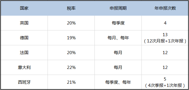 歐盟5國(英德法意西)增值稅(VAT)稅率及申報(bào)周期對(duì)照表: