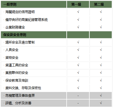 現(xiàn)時(shí)大部分海關(guān)當(dāng)局同樣需要一個(gè)靈活的機(jī)制,以應(yīng)付復(fù)雜的國際供應(yīng)鏈問題及執(zhí)行相關(guān)的保安工作。 長遠(yuǎn)而言,香港海關(guān)需要為發(fā)展相互認(rèn)可協(xié)議而按照國際標(biāo)準(zhǔn)推行「香港認(rèn)可經(jīng)濟(jì)營運(yùn)商計(jì)劃」,亦可因應(yīng)個(gè)別公司的業(yè)務(wù)模式、運(yùn)作規(guī)模、風(fēng)險(xiǎn)概況及其他相關(guān)因素,具彈性地制定保安措施。海關(guān)為配合業(yè)界的不同需要,為參與伙伴計(jì)劃的公司提供兩個(gè)級別的認(rèn)可經(jīng)濟(jì)營運(yùn)商資格。 海關(guān)將評估公司在符合既定的準(zhǔn)則方面已達(dá)到的水平,并據(jù)此授予分級認(rèn)證,準(zhǔn)則列明如下: