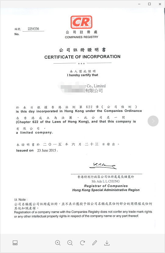 香港公司注冊證書、商業(yè)登記證、章程、法團成立表格、章印、法人身份證;