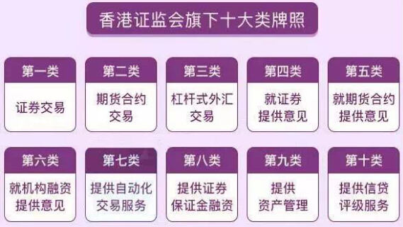 ??? ?首先為大家介紹一下香港金融牌照分類:在香港,證監(jiān)會管理著10類牌照,每一類牌照對應(yīng)一塊業(yè)務(wù)。要從事相應(yīng)的業(yè)務(wù),就必須獲得對應(yīng)的牌照。