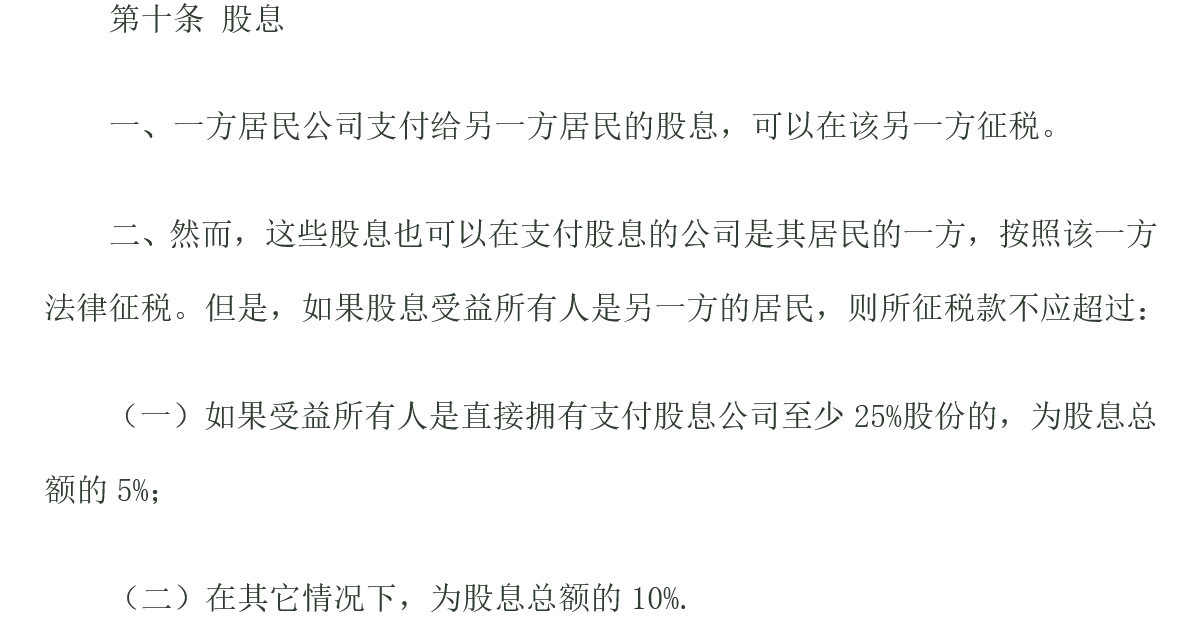 二、然而,這些股息也可以在支付股息的公司是其居民的一方,按照該一方法律征稅。但是,如果股息受益所有人是另一方的居民,則所征稅款不應(yīng)超過: