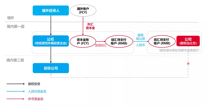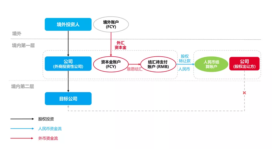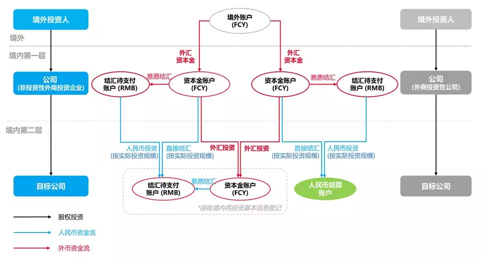在利用結(jié)匯人民幣資金以股權(quán)并購的方式進(jìn)行境內(nèi)再投資的情形下,就外商投資性公司而言,資本金應(yīng)當(dāng)匯入股權(quán)出讓方的人民幣結(jié)算賬戶且資金使用不受限制,賣方無須進(jìn)行接收境內(nèi)再投資基本信息登記;而就非投資性外商投資企業(yè)而言,資本金應(yīng)當(dāng)匯入股權(quán)出讓方的結(jié)匯待支付賬戶,由股權(quán)出讓方按照結(jié)匯待支付賬戶的支出范圍進(jìn)行使用,賣方還應(yīng)辦理接收境內(nèi)再投資基本信息登記。
