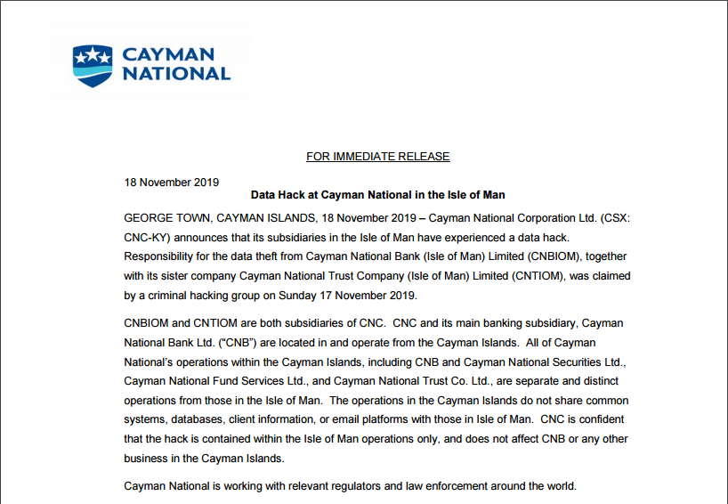 針對(duì)此次數(shù)據(jù)嚴(yán)重泄露事件,11月18日,開(kāi)曼國(guó)家銀行公開(kāi)發(fā)布一份聲明,證實(shí)其數(shù)據(jù)信息遭到入侵: