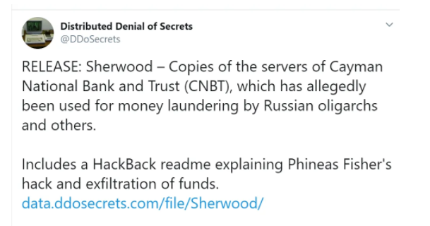 事件還要回到上周五(11月15日),一自稱PhineasFisher的黑客或黑客組織公開(kāi)發(fā)表了一份宣言。宣言稱,他們已經(jīng)入侵了開(kāi)曼國(guó)家銀行(Cayman National Bank)竊取了數(shù)十萬(wàn)美元,并高調(diào)地表示在數(shù)字時(shí)代搶劫銀行是一種非暴力、低風(fēng)險(xiǎn)、高回報(bào)的行動(dòng)。隨后,該黑客還通過(guò)網(wǎng)站 Distributed Denial of Secrets(以下簡(jiǎn)稱“DDoS”) 公開(kāi)了從開(kāi)曼國(guó)家銀行竊取到的 2.21 TB數(shù)據(jù)。