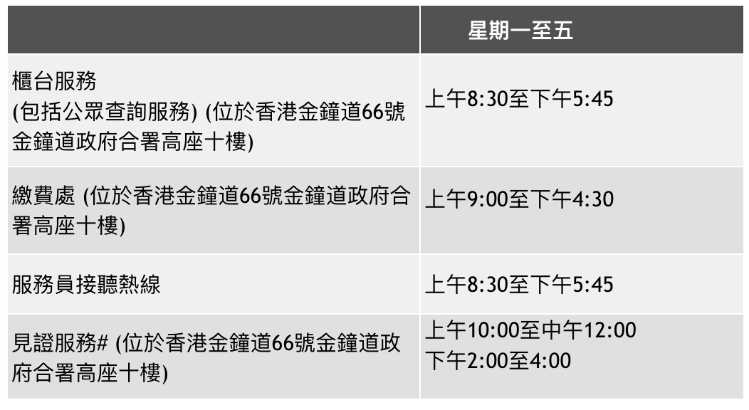 柜臺服務(wù)由5月4日起恢復(fù)正常辦公時(shí)間正常辦公時(shí)間的詳情如下:公司注冊處(金鐘道政府合署)