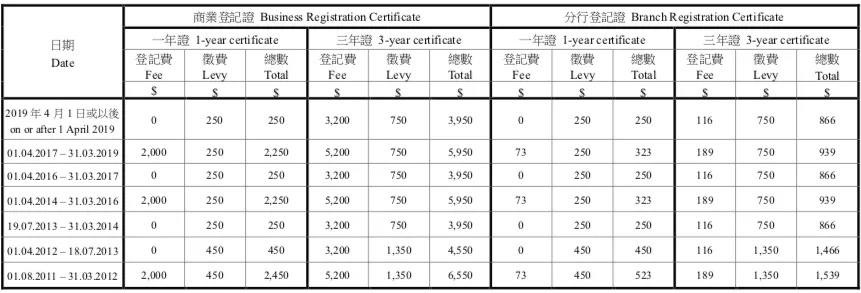 不同年份生效的商業(yè)登記證,所需繳付的商業(yè)登記費(fèi)不同,詳情如下表: