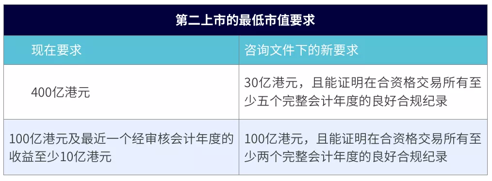 根據(jù)咨詢文件,未來海外發(fā)行人到香港第二上市的最低市值要求將會降低,具體如下: