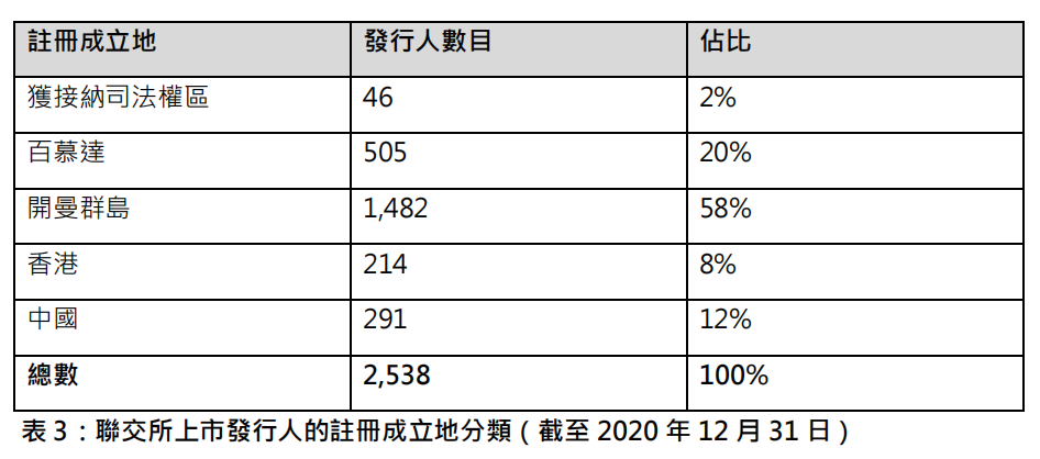 ? 值得注意的是,根據(jù)咨詢文件披露,在聯(lián)交所上市發(fā)行人的注冊成立地分類統(tǒng)計(jì)中,截至12月31日,百慕大、開曼群島、香港和中國的發(fā)行人數(shù)目為2492家,所占比例高達(dá)98%,其他20多個獲接納司法管轄區(qū),比如BVI、澤西島等,發(fā)行人數(shù)目總計(jì)僅46,占比為2%,幾乎可忽略不計(jì)。