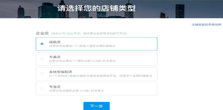 選擇用戶成功登錄后,進入入駐選擇頁面,店鋪類型有旗艦店、賣場型旗艦店、專賣店、專營店。商家根據(jù)自身需要選擇入駐的店鋪類型。不同入口需要上傳的資質(zhì)不同。