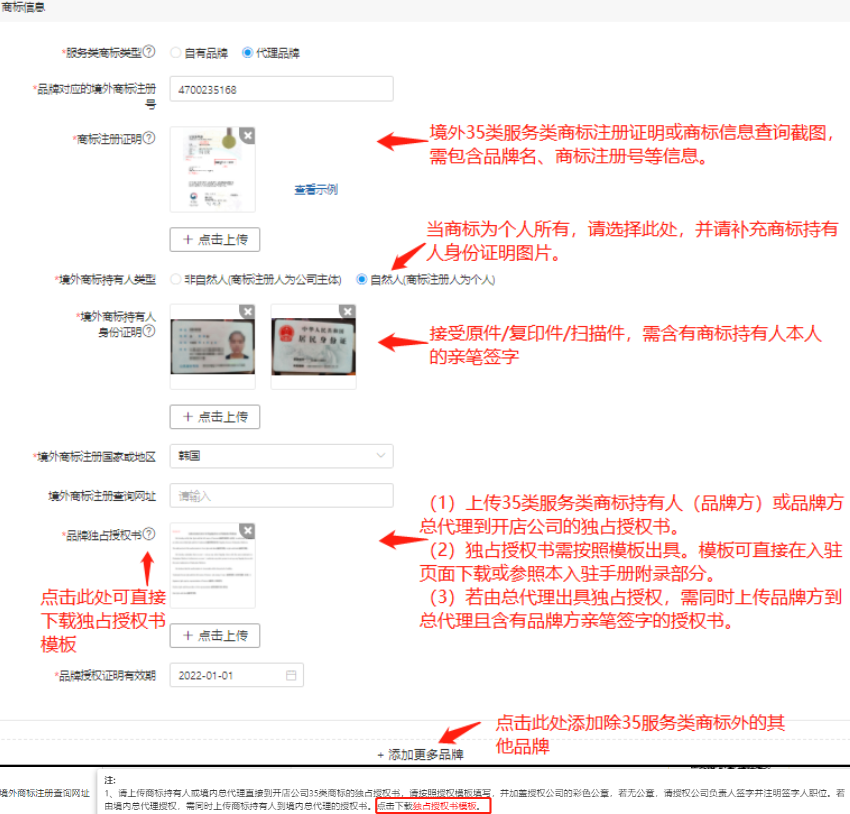 (1)需上傳境外35類服務(wù)類商標注冊證明或商標信息查詢截圖,以及35類服務(wù)類商標持有人(品牌方)或總代理到開店公司的獨占授權(quán)書,授權(quán)書需按照入駐頁面或本入駐手冊附錄的模板出具。若由總代理授權(quán),需同時上傳品牌方到總代理的授權(quán)書。