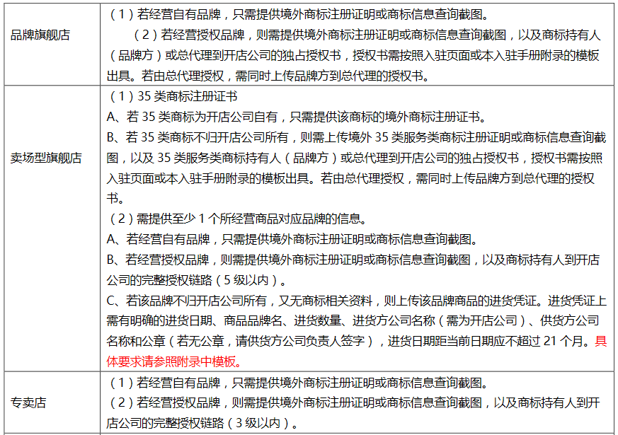 (1)需上傳境外商標注冊證明或商標信息查詢截圖,以及商標持有人(品牌方)或總代理到開店公司的獨占授權(quán)書,授權(quán)書需按照入駐頁面或本入駐手冊附錄的模板出具。若由總代理授權(quán),需同時上傳品牌方到總代理的授權(quán)書。
