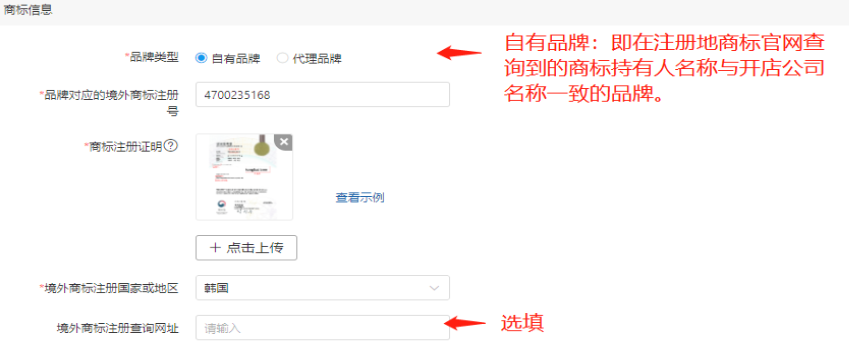 若商標為開店公司自有,品牌類型請選擇“自有品牌”,并填寫商標注冊號和上傳境外商標注冊證明或商標信